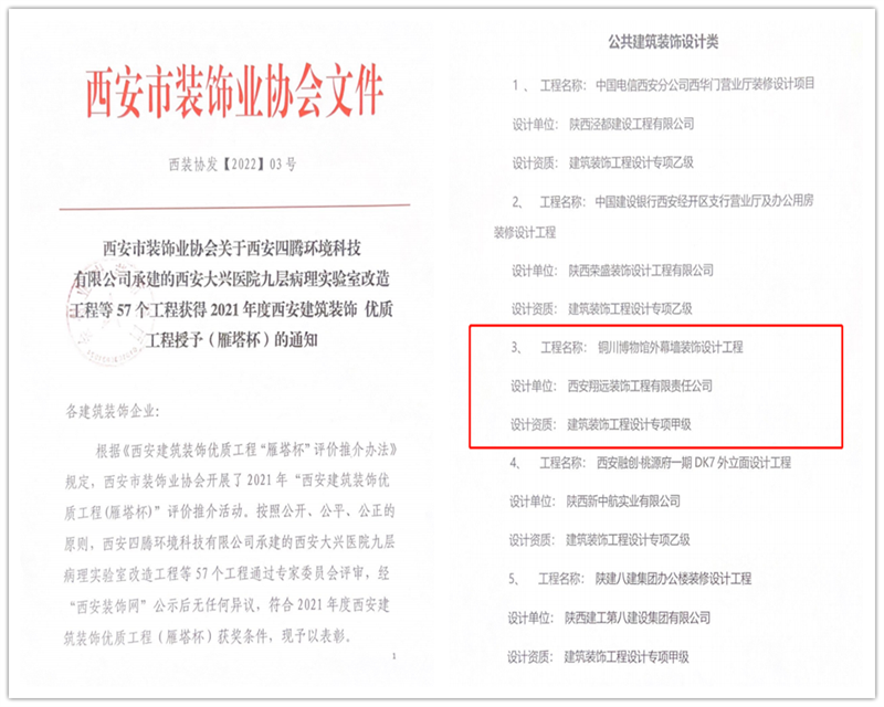 經西安市裝飾業專家評審委員會評審:西安翔遠裝飾工程有限責任公司被評為2021年度建筑裝飾行業優秀企業。