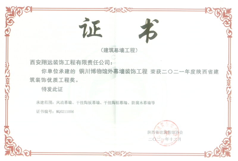 我司設計承建的銅川博物館外幕墻裝飾工程榮獲“陜西省建筑裝飾優質工程獎”。