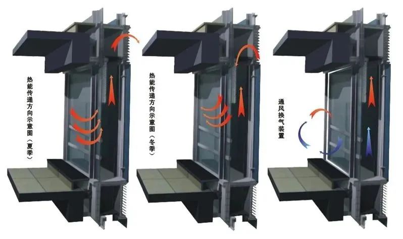 呼吸式幕墻在隔音降噪上的效果非常顯著,可以更好的改善室內空氣質量,改善室內熱環境,同時還可以通過百葉調整室內光線,但是它對施工技術又要求非常高,除多一層的立面構造外,還包含了遮陽系統、通風系統以及控制系統。