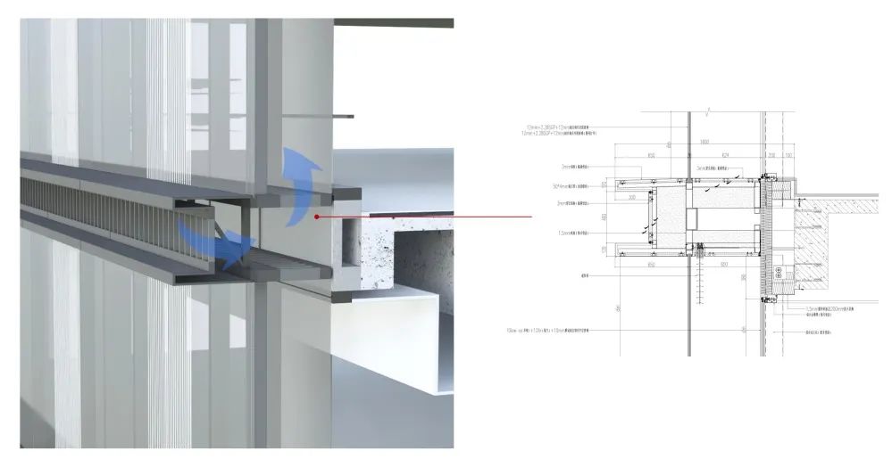 絲路創智谷項目外立面采用外循環自然通風雙層幕墻,它由內、外兩道幕墻組成,內外幕墻之間形成一個相對封閉的空間,空氣可以從下部進風口進入,又從上部排風口離開這一空間,這一空間經常處于空氣流動狀態,熱量在這一空間流動。