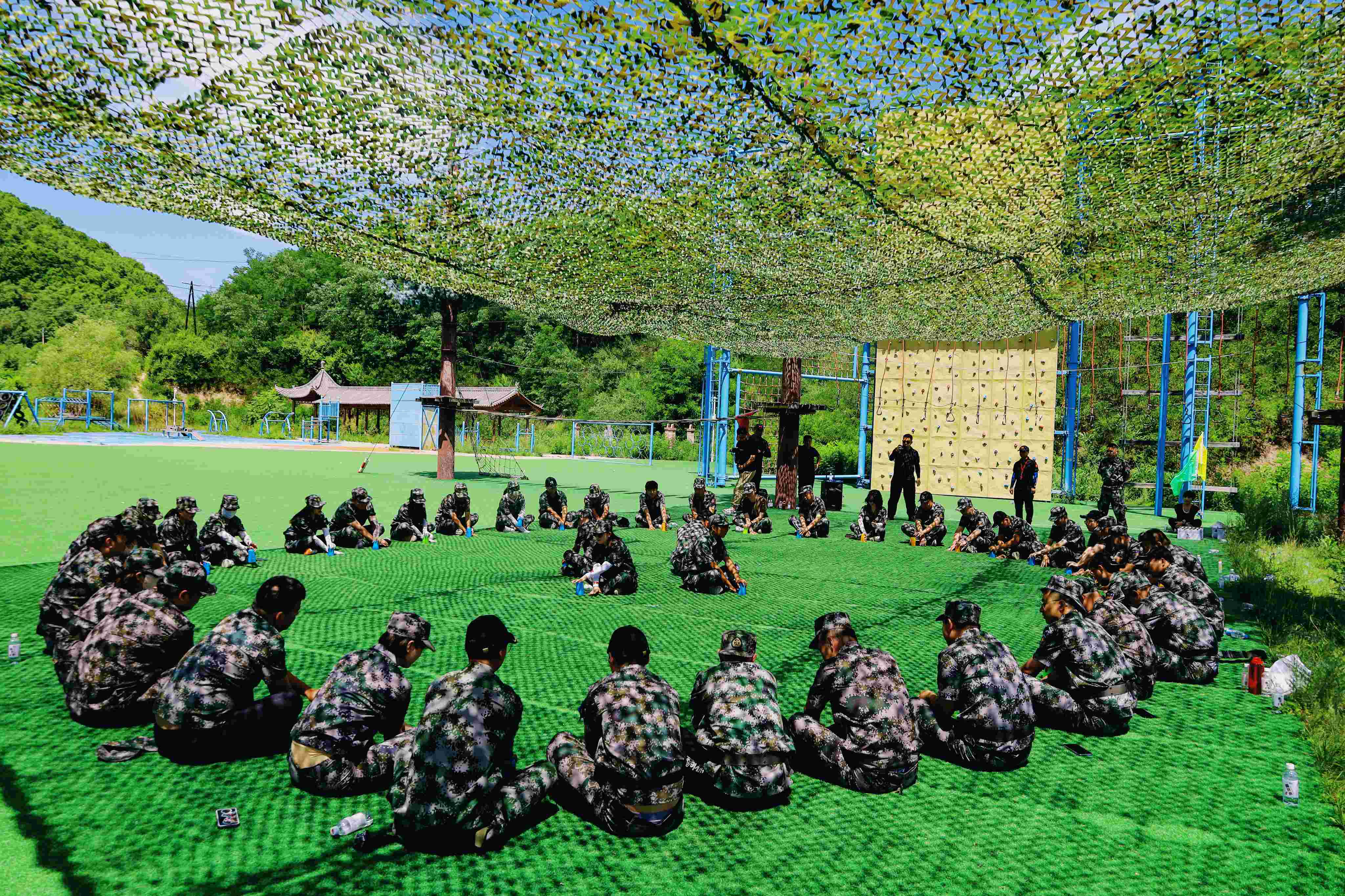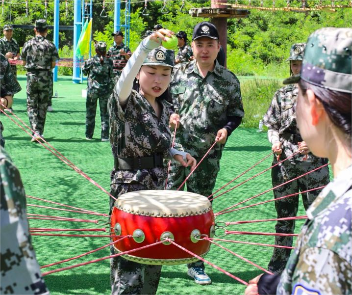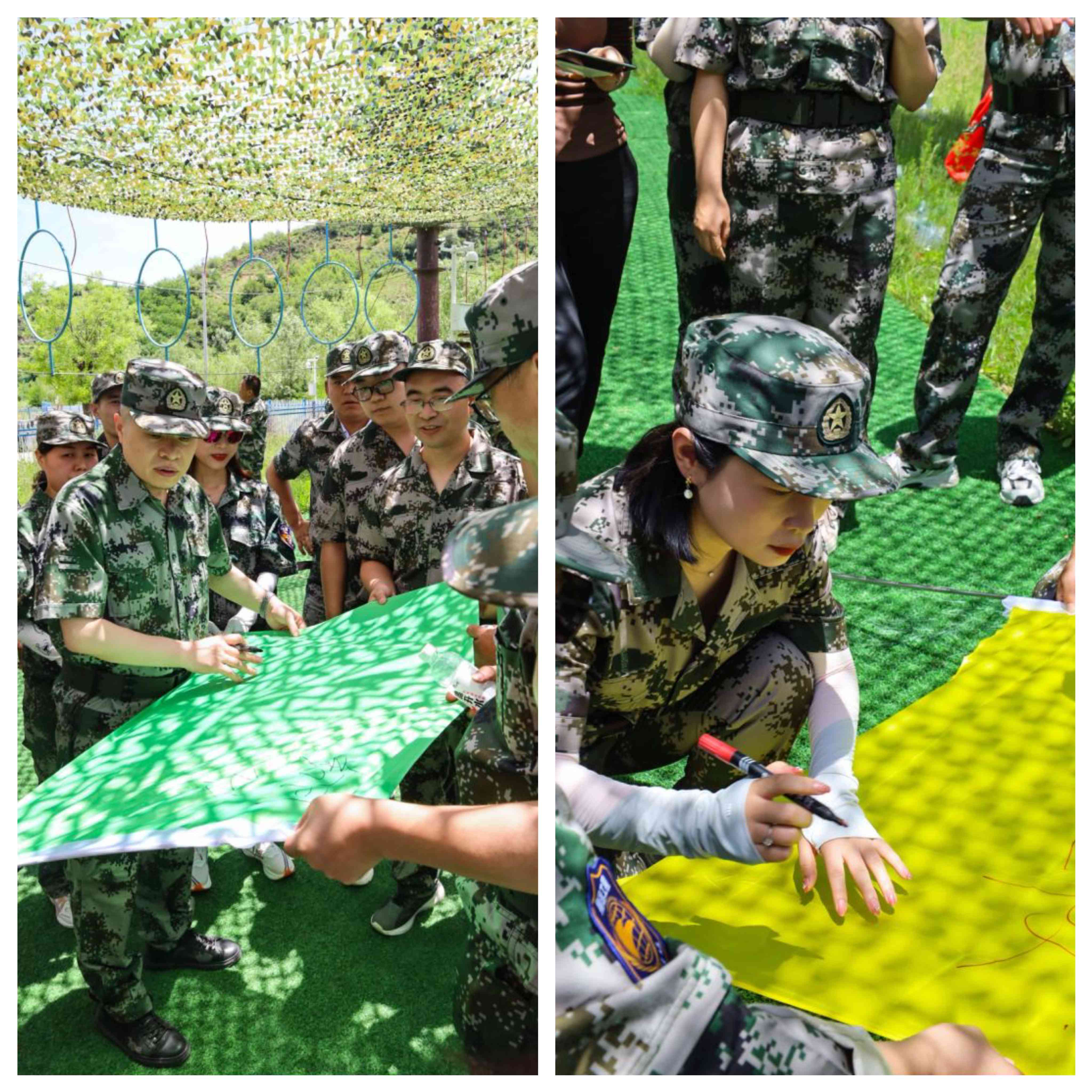 參觀項目結束后,正式進入到我們團建培訓中。本次團建地點設在我們的革命圣地——延安,希望紅色精神能一直伴隨著我們翔遠人,大家熱情高漲,換上定制的迷彩服,精神抖擻,整裝待發。集結完畢,教官給我們做了莊重嚴肅的開營儀式。開營儀式結束后,將我們整個大團隊分為三隊,每隊都有自己的隊名,隊旗、隊呼、隊歌。只見大家一個個集思廣益,群策群力,都想為自己的小隊出一份力。