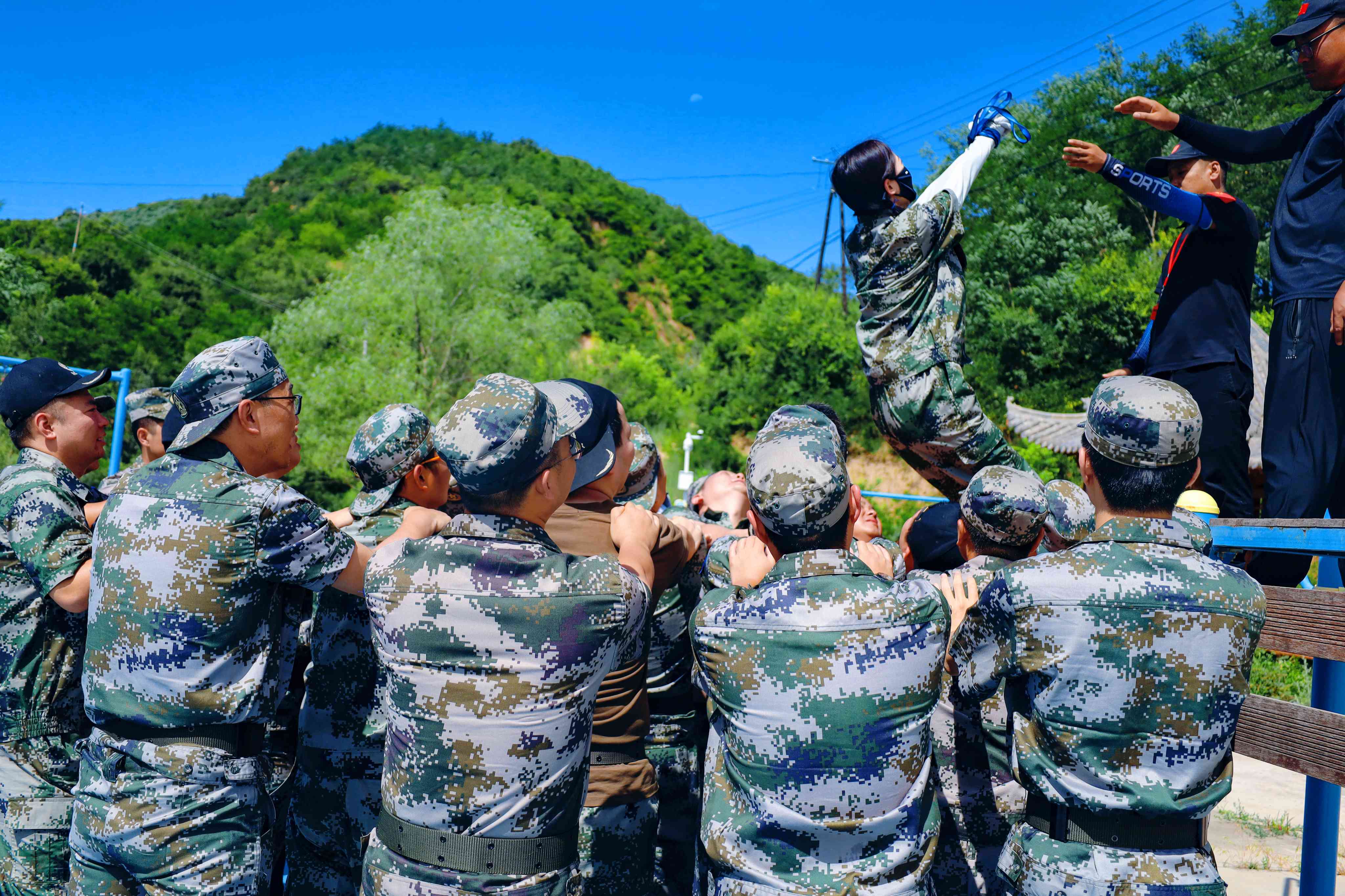 信任背摔是站在一米多高的背摔臺,心中真的有一種害怕的感覺。其實膽怯不是來自背摔臺的高度,是來自背摔的方式。一個人直挺著往后倒,但是當你喊出 ”兄弟們準備好了嗎?” “時刻準備著”聽到大家發自心底的吼聲, 心中莫名就有了一股力量,信任的力量,義無反顧倒下去。因為你知道你的這幫兄弟們一定會護你周全。